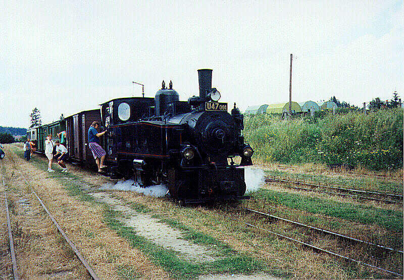 ALT=Úzkorozchodná parní lokomotiva U47.001 v žst. Nová Bystřice 27.7.1997